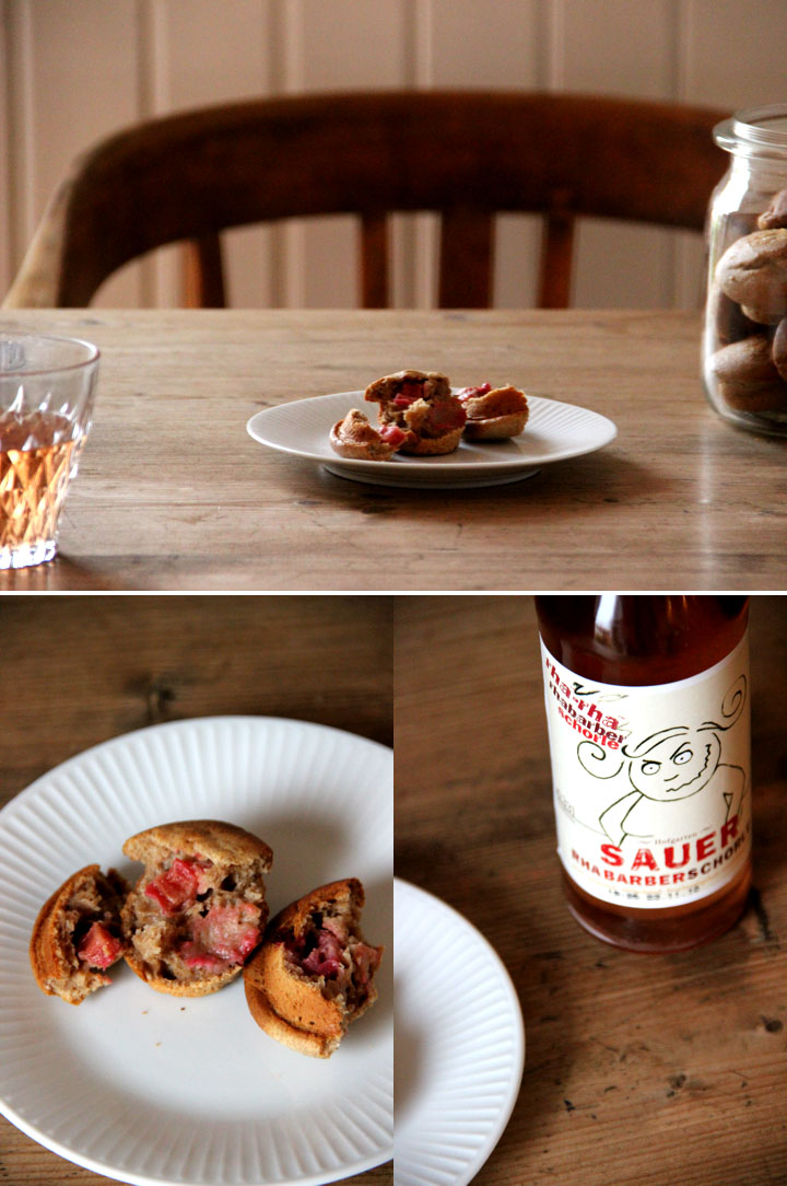 {sugar in the morning} – nach sauer kommt manchmal bitter. Verbittert ist doof würde das kleine Mädchen auf der Flasche denken und lieber mal laut Rumgrummeln bis das Sauer raus ist um süße Rhabarber-Küchlein zu zupfen. Statt Weizen ein Teil Roggen im Teig – der ja eigentlich seine Heimat im Brot hat. Heute fremdgegangen ins Süß. Wer lieber treu und nicht so vollwertig sein mag – einfach helles Weizenmehl verwenden. Try to fly!