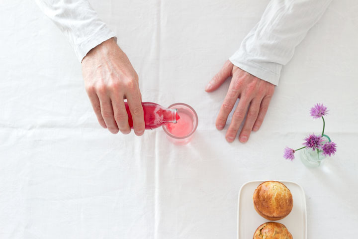 Eiertörtchen mit Schnittlauch und dazu Rhabarbersirup. Zurzeit muß man alles zusammen raffen was der launische Sommer so zu bieten hat. Den süßen Roten fehlt noch ein wenig die wärmende Sonne, aber die ist jetzt ja versprochen. Bis dahin Balkonschnittlauch, der bei uns einen geschützten Platz bewohnen darf, jedes Jahr wieder seine grünen Stängel gen Himmel streckt und im Wind seine Blüten wiegt. Rhabarber vom Marktstand des Vertrauens, für mich zum ersten Mal mit Zucker versirupt. Die Fotos waren erst ganz anders gedacht, ein ‚Styling-Konzept‘ geplant – die Umsetzung gefiel mir nicht – und ein spontaner Hups das ging daneben vom Model war auf einmal viel schöner, als das vorgestellte. Der puderig Rosa farbene Sirupsee auf strahlend weiß gebügeltem Leinen mit herzlichem Lächeln und drei Klicks festgehalten mein ‚everyday pretty‚. Chives egg cake with powdery pink rhubarb syrup lake. A small ‚accident‘ and the styling concept changes in ‚everyday pretty‘. Love ‚home‘ from Josh Brine. Enjoy your midweek!