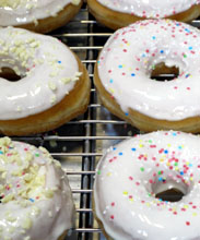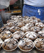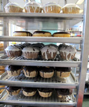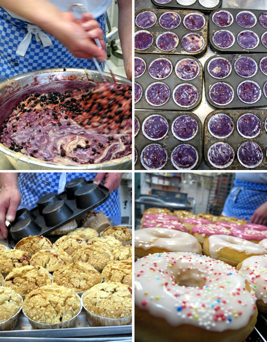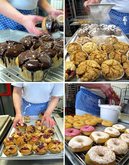 Das und noch viel mehr habe ich gestern Morgen lernen dürfen, in der Backstube beim Muffinmann in Hannover. Dekorschnee statt Puderzucker und das Gebäck sieht auch nach Stunden appetitlich und weiß bepudert aus. Muffins aus dieser kleinen Backstube sind bio, vegan und köstlich verlockend. Wenn du einmal in den Genuß eines Originals vom Muffinmann gekommen bist – egal ob Pfirsich Streusel, Rote Grütze, Apfel Zitrone,…oder Blaubeere, du wirst den Geschmack bei jedem fremd gegessenen vermissen. Bei uns in Hannover ist der Muffinmann Muffin ein stehender Begriff. Jeder hat gleich ein Bild vor Augen, den Geschmack im Mund und das genußvolle Grinsen im Gesicht. Mit einer kleinen Filiale inklusive Schaubäckerei fing 2001 alles an. Konditormeister Edzard Conring hat sein kleines Unternehmen von damals bis heute auf drei Filialen, die jede für sich von einem anderen Stadtteil geprägt und besonders ist, erweitert. Die Schaubäckerei wurde zu klein um alle Muffinliebhaber zu beglücken, deshalb gehen die fleißigen Bäcker heute in einer kleinen ausgelagerte Backstube ihrem Handwerk nach. Gestern Morgen durfte ich in die Zaubertöpfe der Bäcker schauen und bin somit jetzt Eingeweihte in das Geheimnis der unwiderstehlichen Gebäckstücke. Aber irgendwie muß es da noch einen Zaubertrick geben – denn die Zutaten sind ähnlich denen in meiner kleinen Hausbäckerei – der Geschmack und das Aussehen aber nicht annähernd vergleichbar.
