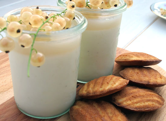So viele herrlich leckere, süße, kunterbunte Obstfarben zurzeit – da haben mich die Johannisbeeren durch ihr zartes Weiß gestern auf dem Markt besonders angelacht. Mit dem Gedanken war auch gleich die Idee da – Petites Pots de Crème mit Johannisbeergelee und Madeleines.