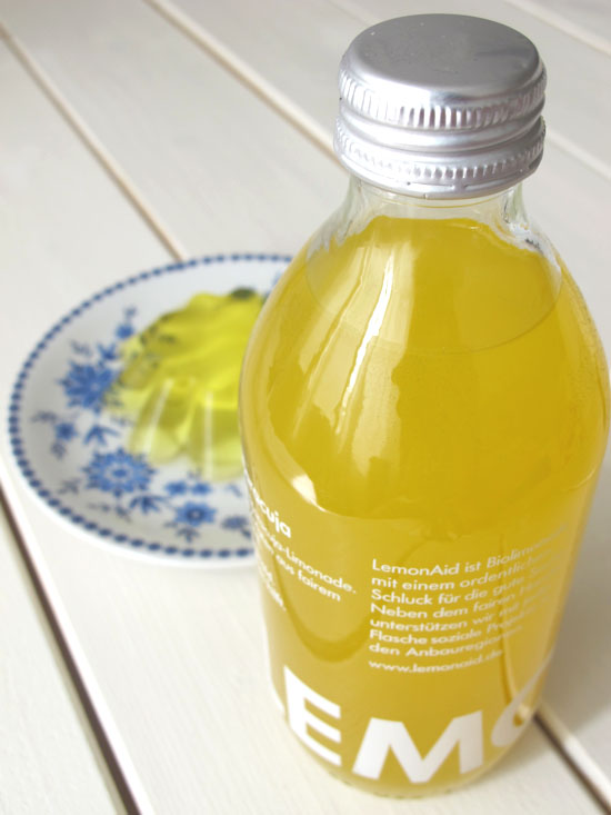 Es war ein Test. Ich bin schon lange auf der Suche nach einer echten Alternative für Wackelpudding aus der Tüte. Da ist mir gestern diese herrlich sonnengelbe LemonAid Flasche beim Kaffeetrinken aufgefallen. Schwups gekauft und zu Hause mit einem Blatt Gelatine zu Pudding geköchelt. Und was soll ich sagen, perfekt ist das Ergebnis zwar noch nicht, aber es sieht auf jeden Fall sehr authentisch nach Wackelpeter aus.