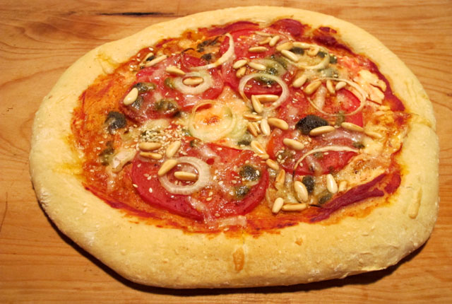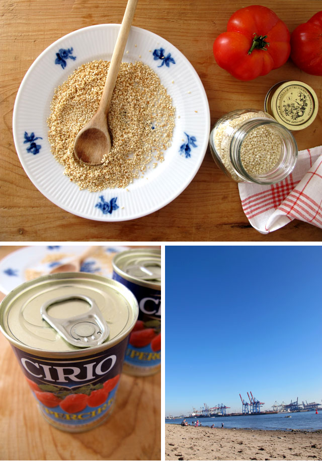 Ein echter Klassiker bei uns – Focaccia. Eine Pizza gelingt, trotz extra erworbenem Pizzastein und viel Teiggefühl im heimischen Herd doch nicht so dünn und knusprig wie beim Italiener um die Ecke. Deshalb ist mein Favorit die fluffigen Focaccia Variante. Die Zutaten dafür sind meist immer im Hause und ich darf meine Hände mit Mehl bestäuben. Morgens zubereitet und im Kühlschrank gegangen, ist der Teig abends genau richtig, um mit den Dingen belegt zu werden, die vom Wochenende noch über geblieben sind. Vom Johanna Frühstück hatte ich noch den Sesam Geschmack auf der Zunge, und so wanderte etwas gerösteter Sesam in den Teig. Für das Endergebnis gibt es keine festgelegte Rezeptvorgabe. Ich mag statt Tomatensosse gerne erst ein Löffelchen Tomatenmark, darauf Ricotta und ein paar Pünktchen Pesto, oder eine geraffelte Möhre unter den Ricotta. Darauf dann Tomtenscheiben oder was der Kühlschrank so übrig hat. Ganz fein und würzig – Mozarella, ein wenig Parmesan und nach dem Backen mit Rucola und Parmaschinken belegen.