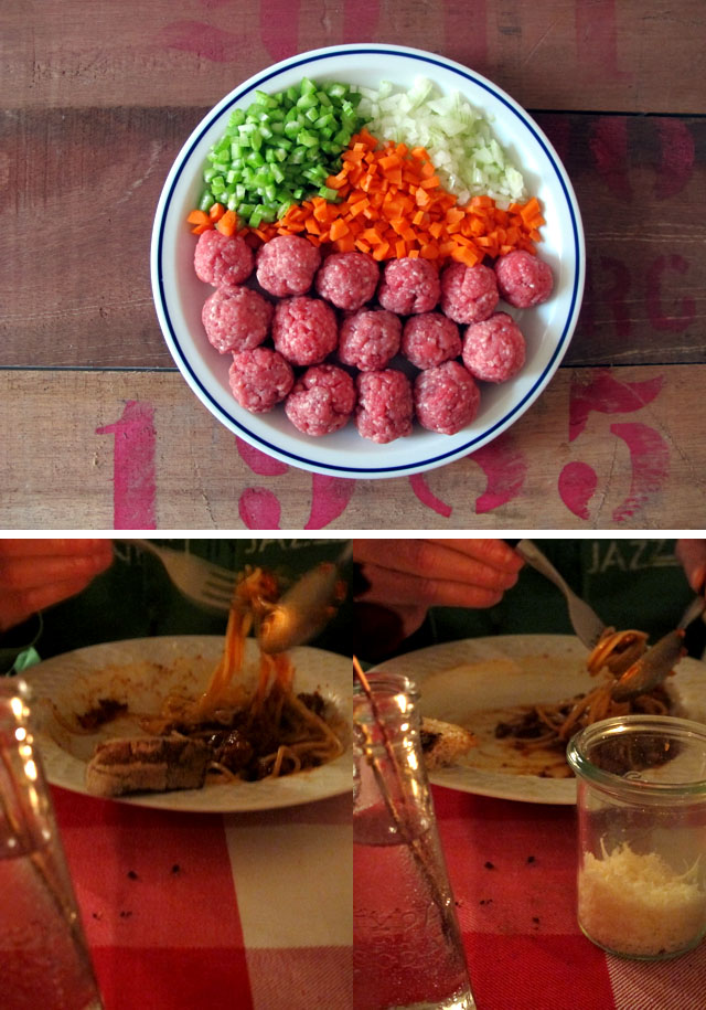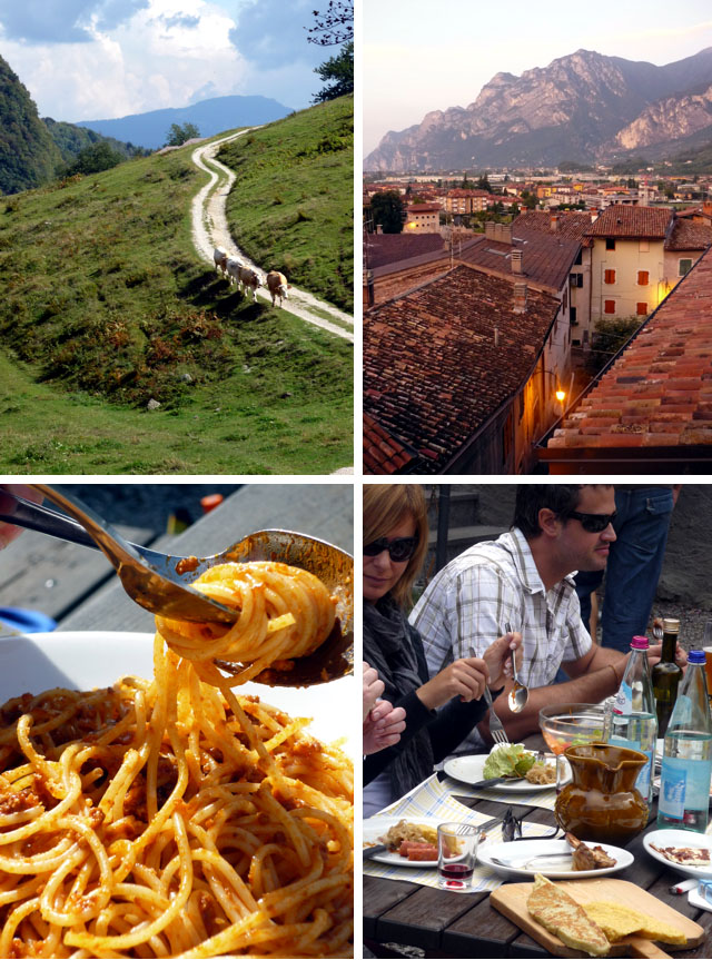 Perfektionismus. Vor ein paar Tagen durfte ich schmunzeld über mich und mein Streben nach dem ausgefeilten Ergebnis sinnieren. Rike kommentierte ‚Du hast die Messlatte mit dem Italiener um die Ecke aber auch ganz schön hoch gelegt‘, als ich verzweifelt von meinen Pizzaexperimenten erzählte. Ja ja der ewige Vergleich, und dann noch mit den echten Könnern versemmelt mir manchmal ganz schön meine neugierige Leichtigkeit. Wie ich hier und jetzt zu diesen Gedanken komme: also am Gardasee im Rifugio Capanna Grassi gibt es DIE PERFEKTE BOLOGNESE und natürlich noch andere Köstlichkeiten, aber diese Bolognese müßt ihr einmal probieren. Mit dem Auto oder dem Mountainbike (Anmerkung vom Mann: es sind 1000 Höhenmeter) von Riva über eine Straße leicht zu erreichen, vorallem Sonntags zur Mittagszeit ein herrlich buntes Treiben italienischer Großfamilien. Ab dem Rifugio sind auch großartige Wanderungen möglich. Nach unseren Urlauben haben wir schon einige Bolognese Rezepte probiert, aber auf der Malga Grassi ist und bleibt sie einfach die Perfekte. Am Sonntag köchelten wir nach diesem bezaubernden Rezept – ich war kritisch und der Mann glücklich.