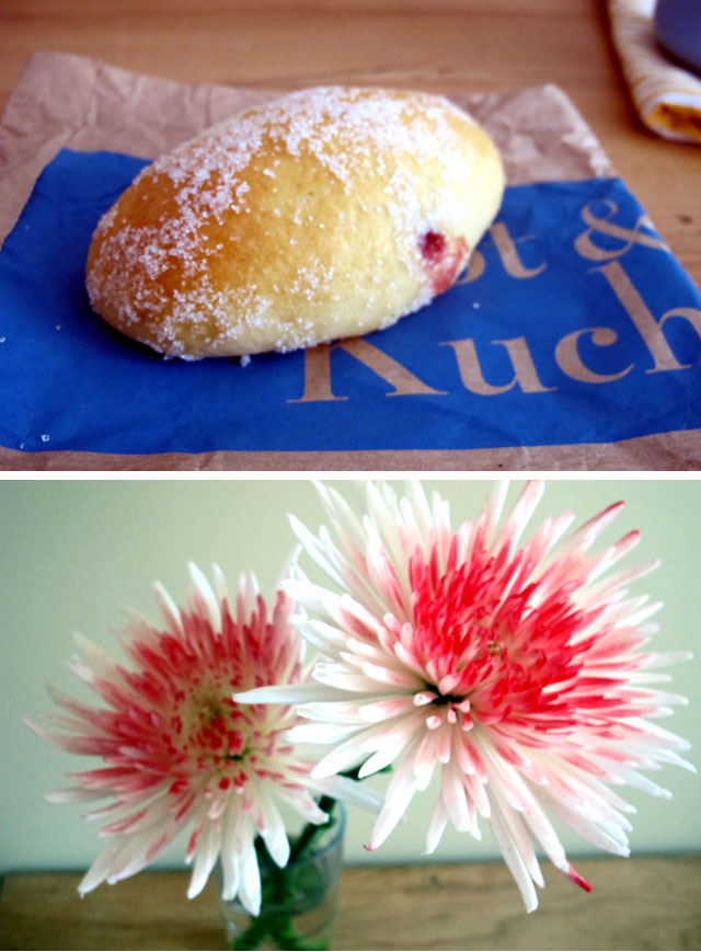 Wochenmarktschätze. Strahlende Blumen und gebackener Vanillequark.