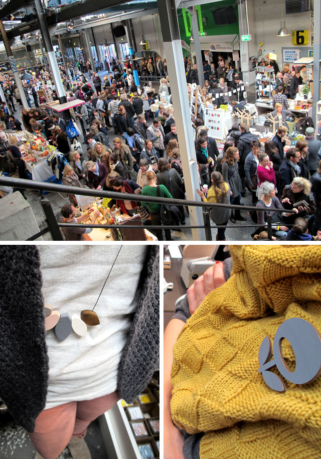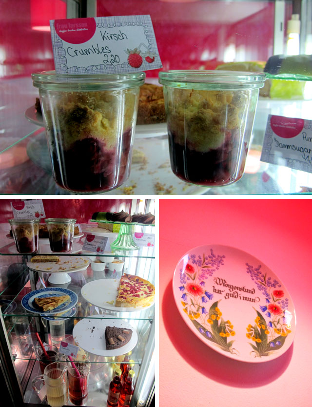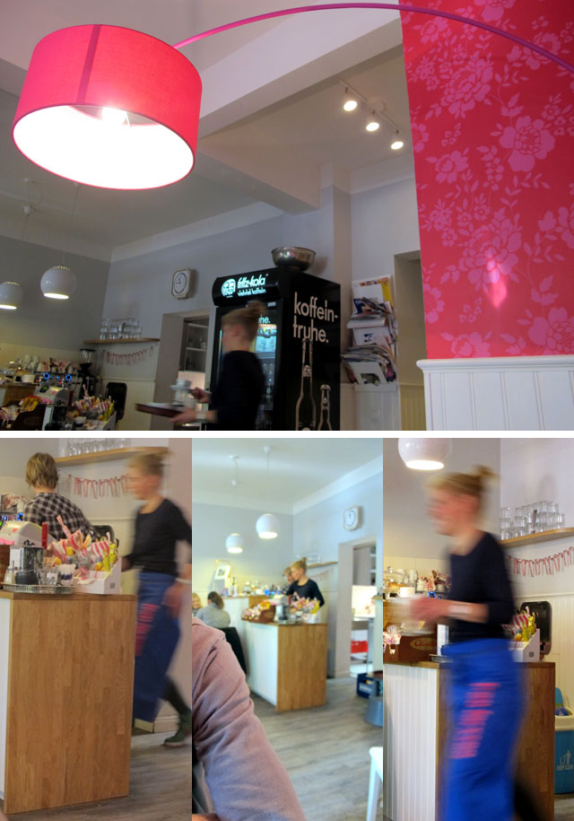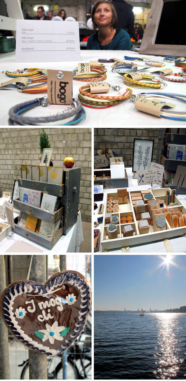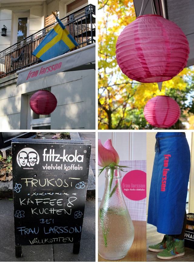 Das und noch viel schöner habe ich gestern in Hamburg bei Frau Larsson gelernt. Frau Larsson ist seit gestern mein Lieblingskurzurlaubsziel in Schweden – falls gerade mal kein günstiger Flug im Angebot ist. Ein schnuckeliges Café in Winterhude – Liebe auf den ersten Blick, mit so freundlichen Bedienungen, daß wir uns wie zu Gast in einem schwedischen Haus auf einem lebendigen Familienfest gefühlt haben. Sie sind so süß um uns herum gewieselt, beim Servieren unseres alles ist hausgemacht Victoria & Daniel Frühstück für zwei, daß mir die besuchte Caféwelt am Nachmittag ziemlich hartherzig und spröde vorkam. Stolz war ich auf mich, daß ich so viel unbekanntes probiert und geliebt habe: Plättar mit Blåbärsylt und Hallonsylt, Kanelbullar, Sill und ab sofort mein Leibgericht bacon pannkaka nach Morfars Art. Ich mag mein alltäglich süßes Frühstück mit Marmelade Quark Brot, aber einem Tag einfach mal anders entgegen zu blinzeln und sich einen Guten Morgen zu wünschen macht sehr glücklich und verändert etwas. Manchmal muß man wohl all sein kleines Glücksgefühl zusammenkratzen, um es zu sehen. Seelig gestärkt spazierten wir anschließend zum hello handmade Markt im Kampnagel um Freunde zu herzen und Neues zu entdecken (Glück No. Zwei). Voll war es und wuselig, spannend, alltäglich und besonders. Die inoffizielle Auszeichnung für den schönsten Messestand, die goldene Mila geht dieses Jahr an die zwei charmanten Damen von Snug. Gefühlt habe ich mich kurzzeitig wie auf der Woonbeurs in Amsterdam so leidenschaftlich, professionell liebevoll hatten sie ihr kleines Wohngefühl aufgebaut. Gut gestärkt mit neuen Eindrücken und interessanten Gesprächen, bummelten wir unserem Glück No. Drei entgegen – Wandertag mit halb Hamburg um die Alster, mit sternenglitzernder Sonne und fliegend buntem Herbstlaub. Ach ja…Sylt heißt in Schweden Marmelade mit weniger Zucker, stattdessen mit mehr Obst gekocht, deshalb flüssiger als hiesige Marmelade. Meine Marmelade im Keller ist also nach schwedischem Rezept geköchelt und geweckt – ich glaube Schweden und ich werden uns ganz bald wieder sehen, vielleicht sogar mit günstigem Flug – (Vorfreude) Glück No. Vier.