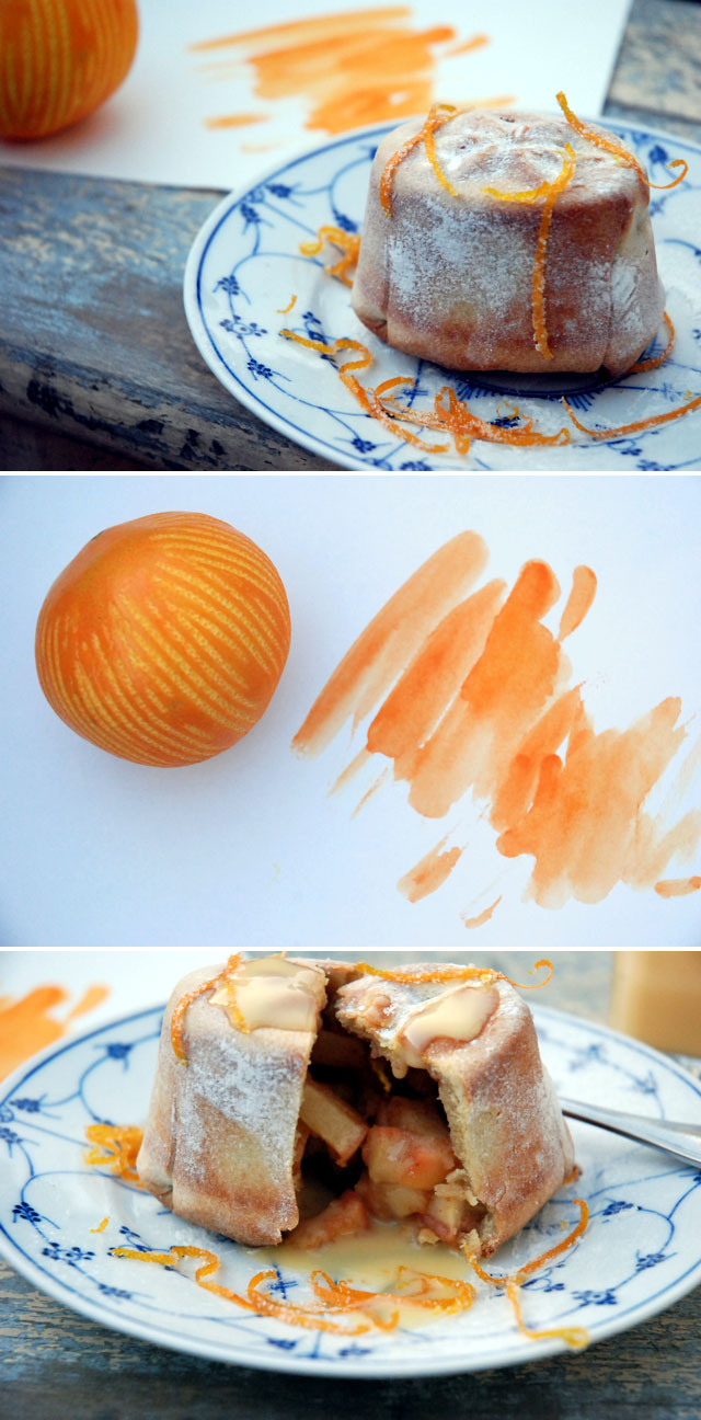 {sugar in the morning} – Apfelküchlein mit Zimt, Orange, Vanillesoße und viel Liebe. Teig Überbleibsel von hier gefüllt mit einer Mischung aus: Apfelstückchen, 1 TL Orangensaft, 1 TL Semmelmehl und 1 TL Zimt-Zucker. Im Ofen für 15 Minuten bei 200 Grad gebacken, mit Staubzucker berieselt und Orangenzesten in Zucker geschmückt. Dazu Aquarellkleks-Schwungübungen für mein Weihnachtspapier.